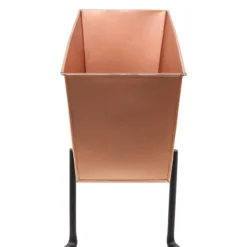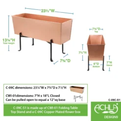 Create a stylish container garden even in a small space with our Copper Flower Box Planter. Perfect for growing on porches, balconies, decks, or for compact urban gardens with poor soil, This copper planting box has a soft satin Copper luster that will age and develop a natural patina finish. A great for container for growing on patios, porches or any small space garden, use it for salad greens, strawberries, flowers and herbs. The wrought iron folding stand lifts the container up for good drainage and air circulation, keeping decks and porches clean of plant debris and staining. Easy to fold and put away in the off- season.