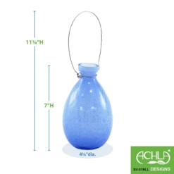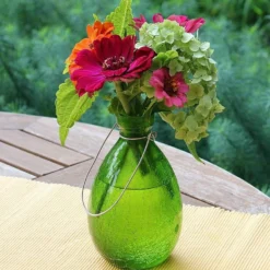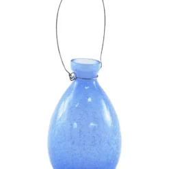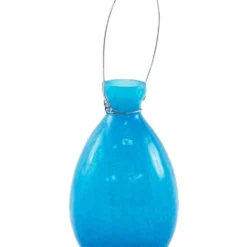 The interiors of these hand-blown glass vases are etched, making them translucent. This limits the amount of sunlight that can get through the glass, protecting the roots of plants and flowers. The strong aluminum wire handle that can be used for carrying or used for hanging the vase from a wall hook near a window or in more ambient light. The top of each vase has a small bottleneck opening suitable for a single bud or small bouquet and makes an ideal vase for a café table.