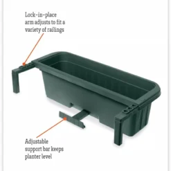 This innovative planter makes it easier than ever to surround your home with lush, colorful plants. The patented design includes sturdy brackets that easily adjust to fit railings from 1″ to 4-1/4″ wide. Simply lock the support arm to the desired width, hang the planter, then fill with your favorite flowers or herbs. No tools, mounting hardware or drilling required. A hidden adjustable support bar keeps planter level. A fast, easy and secure way to add flower boxes to railings along a deck or balcony, or bring color to fences. The evaporative grid self-watering system with 1-quart reservoir helps keep plants healthy and lets you water less often. Not suitable for round railings.