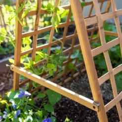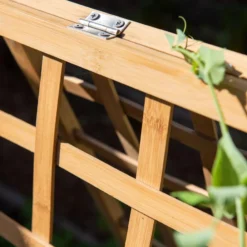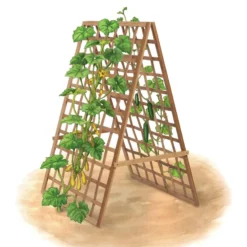 Mind your peas and cukes! And your summer squash and black-eyed Susan vine and smaller winter squash and cardinal flower vine — and tons of other veggies and annual flowering vines! This simple but sturdy bamboo A-frame trellis provides support for light- to mid-weight vining plants. Hand-woven bamboo with 3” spaces in the latticing allows plenty of airflow and room for flowers and veggies to grow through. Fully maximize your growing space by planting shade-loving greens and herbs beneath the trellis.