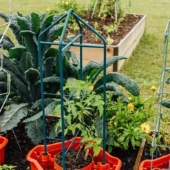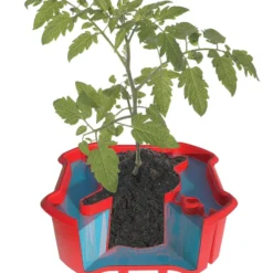The two-piece design allows for use with a new or existing, already established plant. Higher walls protect stems, fend off cutworms, and discourage weeds. The base reservoir holds two gallons of water which releases water directly to the root zone. Tomatoes are notoriously thirsty plants so this feature is key!