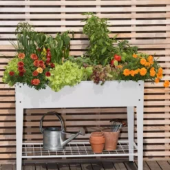 No-bend gardening comfort, a wire shelf to keep essentials organized, and enough depth to grow a variety of herbs, veggies, and blooming annuals. Plus, you’ll get fewer pests and weeds than in an in-ground bed, and you can place it anywhere you have a level surface. Grow a kitchen garden within reach, flowers for patio privacy — the opportunities are abundant!