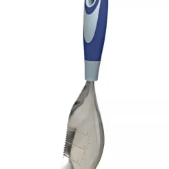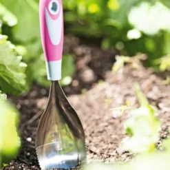 Six-in-one tool does the work of a cultivator, trowel, weeder, scoop, hori knife, and bulb digger. Sharp, serrated edges easily cut through roots and vines. The pointed tip breaks through packed soil and is handy for making trenches and furrows for planting seeds. Durable stainless steel blade; easy-grip silicone handle. The spoon-shaped scoop is etched in increments of 1″ up to 4″ so you can determine the proper planting depth for seeds and bulbs.