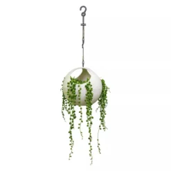 This set of two adjustable hanging pots gives you the freedom to show off your plants in whichever arrangement you choose. The innovative modern design allows you to hang the planters by a single cord, reducing visual clutter. Each planter includes an easy-release cord with a hook; the cord adjusts from 19-1/2 to 39” to create stunning visual effects with multiple pots. Each holds about 4 pounds and has a 1-1/2 quarts of soil capacity. The three open spaces at the top give a perfect canvas to mix and match plants as desired. Perfect for cacti, succulents and ivy, they are also fabulous in your kitchen to grow fresh herbs.