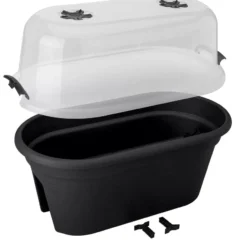 This balcony planter with cover is a mini-greenhouse specially designed to fit balcony railings, chain link fences, wrought iron railings, or any vertical divider up to 2-1/2″ wide. The clear, heavy-duty cover is 7″ H and has two adjustable air vents. The cover locks onto the planter so it won’t blow away. With a generous soil capacity, this planter is a great way to start seeds early in a small outdoor space such as a balcony.