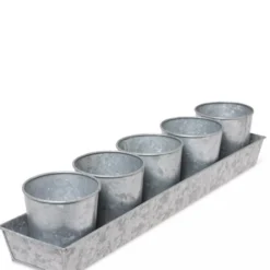 - Vintage-looking planters and tray are crafted of genuine galvanized tin