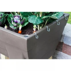 This self-watering elevated garden holds over 10 gallons of water. Raised for easy access without back pain. Includes potting gravel for self-draining functionality, and S-hooks for hanging accessories.