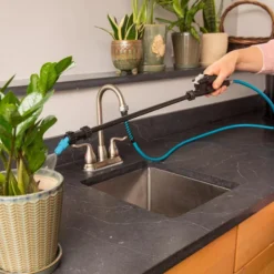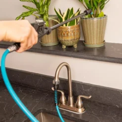 It’s attached to a kink-resistant, manageable and durable straight hose and includes an indoor aerator adapter to fit 15/16″ male or female indoor sink threads, so you can use it for all your houseplants too.
