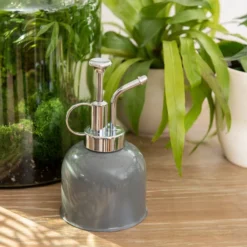 A fine mist in a fine package! This stylish handheld sprayer in a vintage look provides the perfect sprinkling of moisture to satisfy both humidity-loving and low-water-use plants. Gently spritz sprouting seedlings to keep soil wet without washing it away. Give a generous, jungle-like mist to thirsty tropicals and finicky ferns. Keep epiphytes looking right day and night. Compact size makes it easy to move between all your houseplant duties. Charming vintage style makes for an attractive display on plant stands, windowsills, or countertops. All-stainless steel pump components are strong and durable. Available in Gray or Steel.