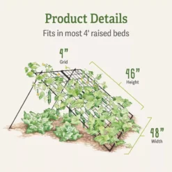 Misshapen, yellowed cucumbers will be a thing of the past when you use this space-saving trellis to support plants in your garden. The sturdy, powder-coated steel frame supports heavy loads and has big 4″ grids for easy harvesting. Lean-to design gives you room to sow salad greens under the trellis for an extra crop before your cukes mature. Large Cucumber Trellis is 48″ wide x 48″ high and fits in most 4′ raised beds.