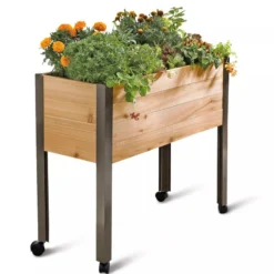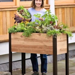 Grow an abundance of food and flowers in a compact space. This lovely planter box is made of rot-resistant lumber and features our signature lifetime aluminum legs. Casters make it easy to roll around on your deck or patio. With a 10-1/2″ planting depth, this garden box is perfect for herbs, veggies, edible flowers, or an entire salsa garden! Your back and knees will thank you, bunnies won’t be able to get at your veggies, and you’ll have fewer weeds to deal with too.