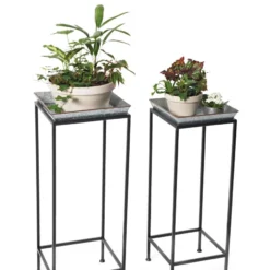 Square Nesting Plant Stands With Galvanized Trays, Set Of 2